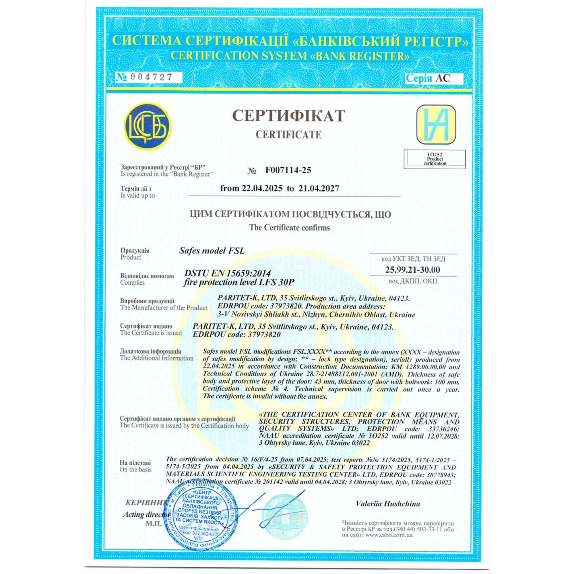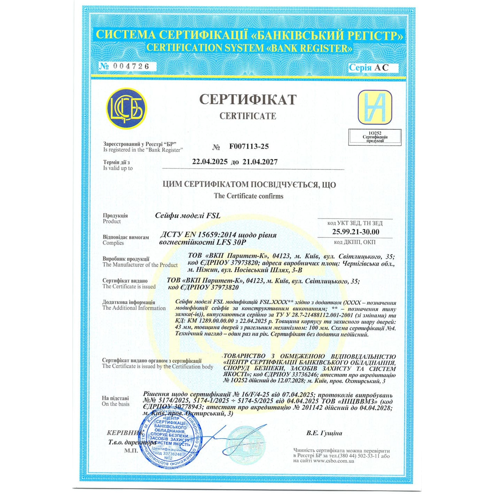 Сейф вогнестійкий Griffon FSL.45.E CREAM - це надійна вогнестійка модель серії FSL з сертифікованим класом захисту (LFS 30P), яка здатна захистити цінні речі від дії вогню протягом 30 хвилин. Особливістю такого сейфа є двостінна конструкція, простір між корпусами якої заповнений теплоізоляційним наповнювачем, що забезпечує високий рівень вогнестійкості. Додатковий захист забезпечує термострічка BASF, розташована по периметру дверей, яка збільшується та заповнює всі отвори сейфа під впливом високих температур.
