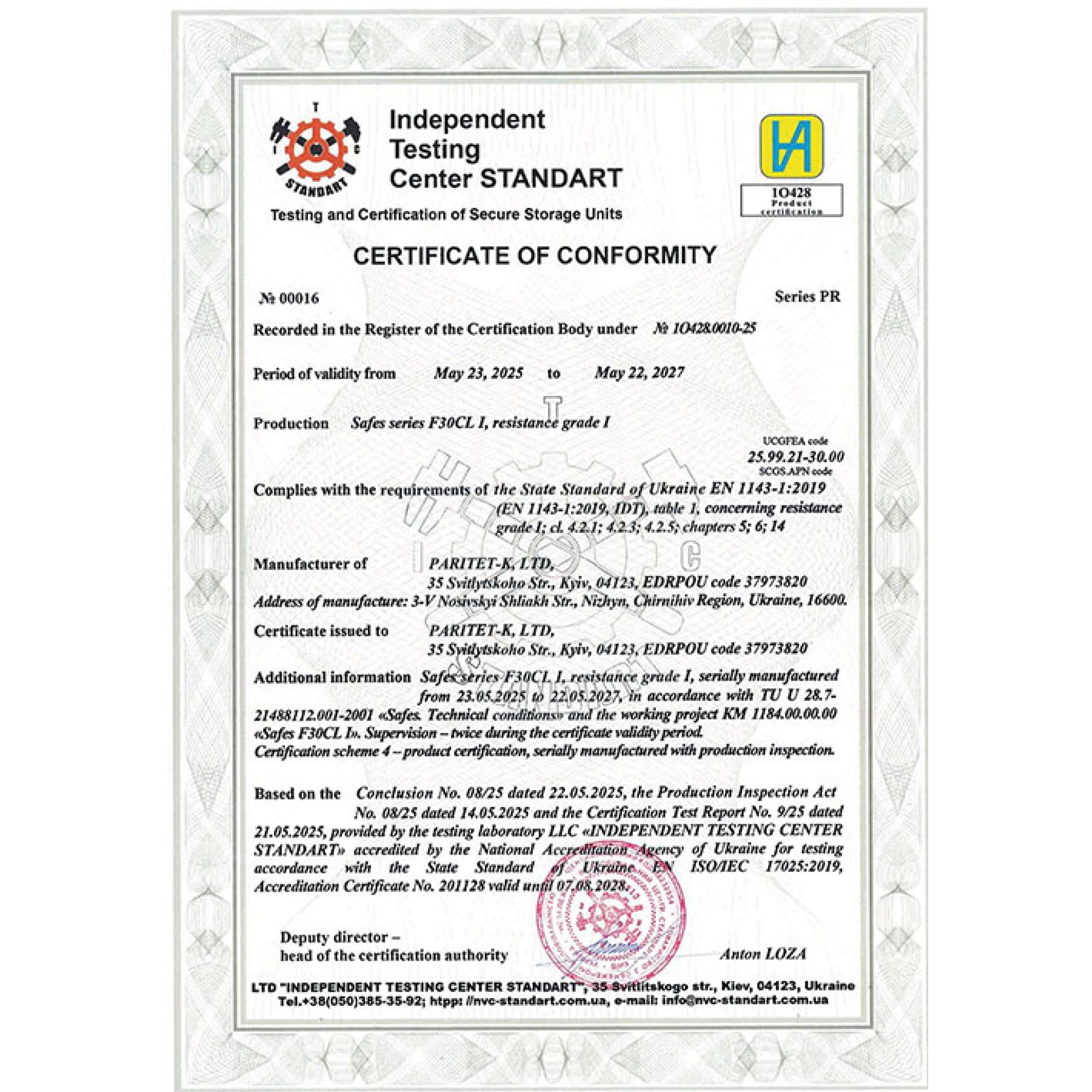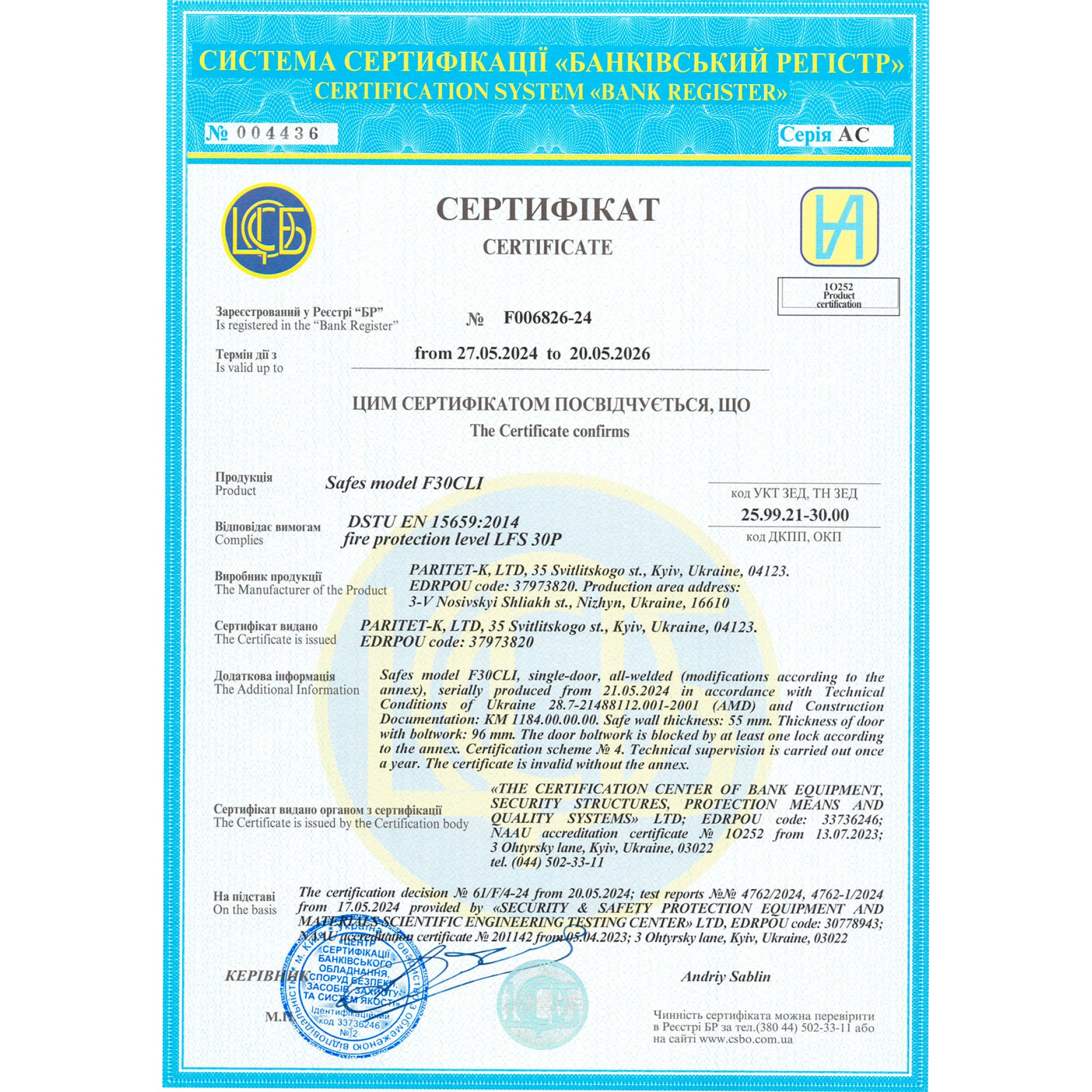 Сейф огневзломостойкий Griffon F.30CL I.50.K - надежная модель серии F.30CLI, которая имеет сертифицированную защиту от вскрытия (I класс по EN 1143-1) и действия огня (класс LFS 30 P). При пожаре в течение 30 минут температура внутри сейфа не будет превышать 170°C, чего достаточно для сохранения бумажных документов и других ценностей. Дополнительную защиту обеспечивает термолента BASF, расположенная по периметру дверей, которая увеличивается и заполняет все отверстия сейфа под воздействием высоких температур.